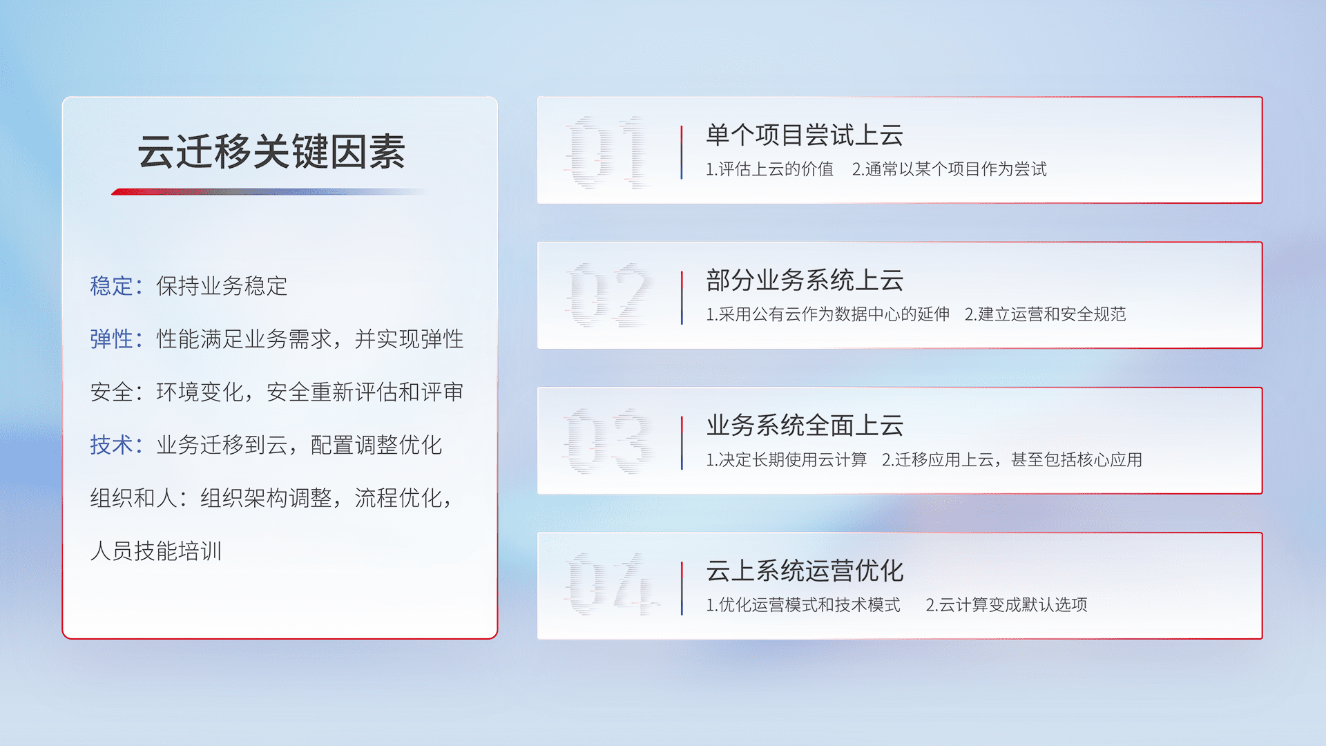 结合实际业务,,从规划设计、、、云平台选型、、、、云原生改造、、数据迁移、、、、集成交付,,,迁移全过程为客户识别最佳上云路径,,,做好风险识别管理,,,,设计网络架构、、身份权限、、、、安全审计合规、、、操作审计、、日志审计、、、监控告警策略、、多站点容灾设计等,,对云上基础设施进行整体规划,,,提升IT治理水平,,以满足弹性、、、高可用、、、高性能的需求。。