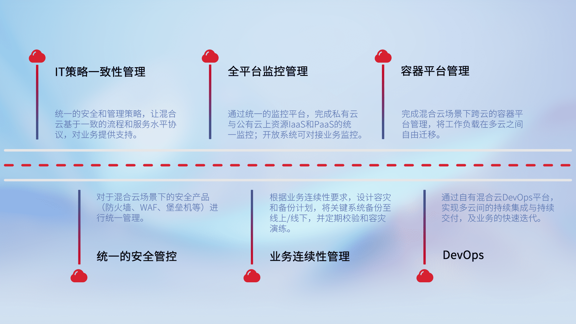 通过多云纳管,,,,以统一的资源数据模型把客户的云资源进行抽象和封装,,进而实现对多云资源的统一操作,,保障云资源管理的可靠性、、稳定性与可用性。。量身定制化运维内容,,配置、、、开发运维、、、补丁管理、、、备份、、、监控、、、、认证和访问管理、、审计和日常巡检等,,,保障在用云过程中的可靠度,,,稳定度以及高可用率。。。。